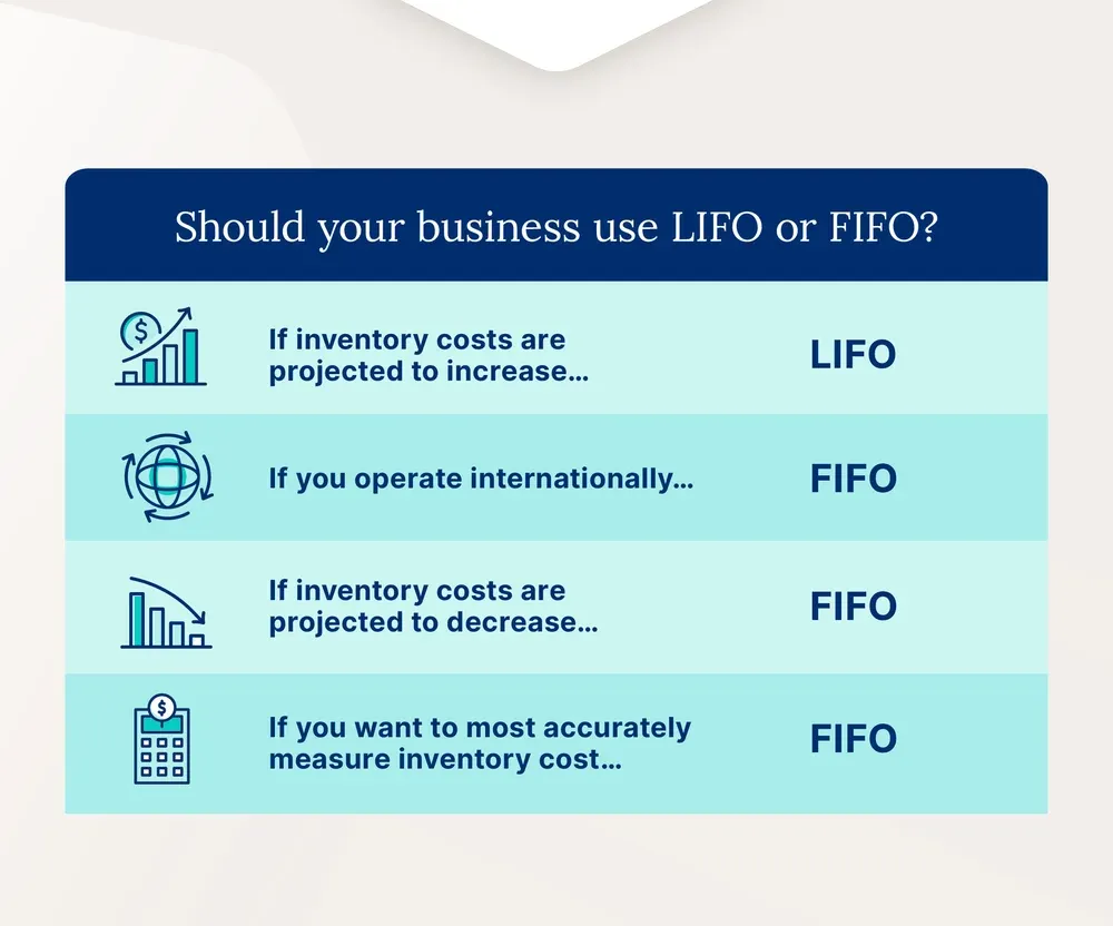 LIFO means Last-In, First-Out. It assumes the most recently purchased items are sold first. During times of rising prices, using LIFO can result in a lower taxable income because your cost of goods sold is higher.